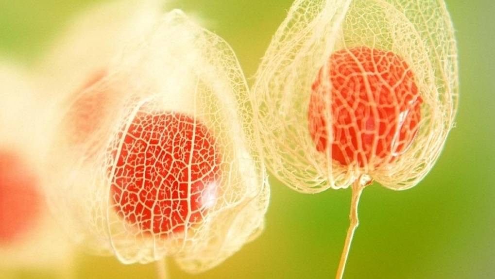 Если же куст с «фонариками» оставить на зиму, то к весне мякоть чашечки разрушится и останется только изящная причудливая сеточка из многочисленных переплетающихся жилок, внутри которой «горит» красная ягодка.