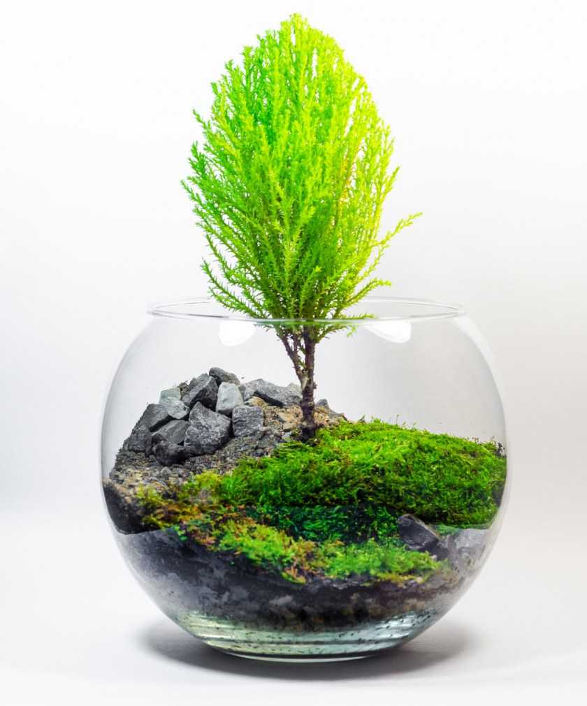 Лаконичное сочетание формы емкости флорариума с внутренней композицией бонсая в импровизированной горной местности