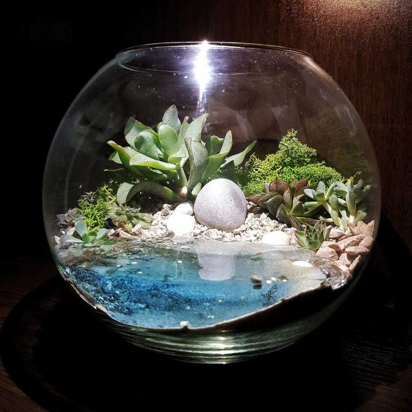 - «полупустыня». Данный вариант идеально подойдет для тех, кто не хочет постоянно следить за состоянием мини-сада, регулируя влажность, полив, и подкармливать грунт. Этот вид флорариума пользуется огромной популярностью, поскольку не нуждается в регулярном уходе. Заселяют такой контейнер исключительно обитателями пустынь и полупустынь, а именно — суккулентами. Это может быть молочай, агава, адромискус, бородник, молодило, малефора, различные виды кактусов и т.д. Их вы свободно можете заселять в террариумы открытого типа. Для создания грунту необходимо перемешать крупно и мелко просеянный песок. В качестве декораций можно использовать камни и керамические обломки. Не стоит поливать растения слишком часто, достаточно раз в неделю, а зимой – в три-четыре недели;