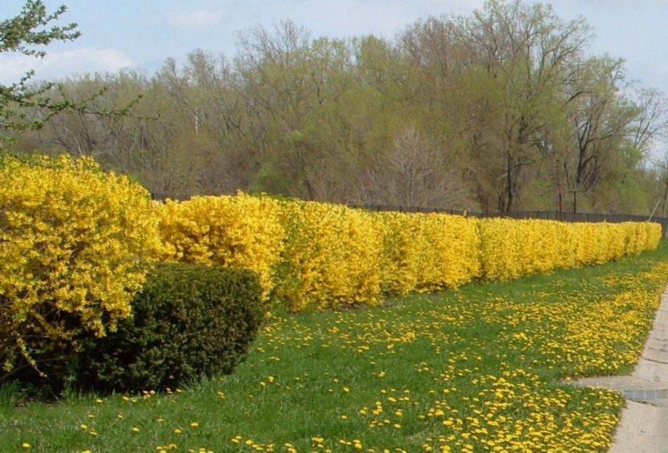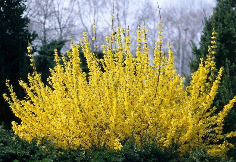 Это растение может стать настоящей изюминкой сада или газона, ведь форзиция сначала цветет, а уже после этого выпускает листики и молодые побеги. Она эффектно выглядит на фоне зеленой изгороди, темно-зеленых хвойных деревьев
