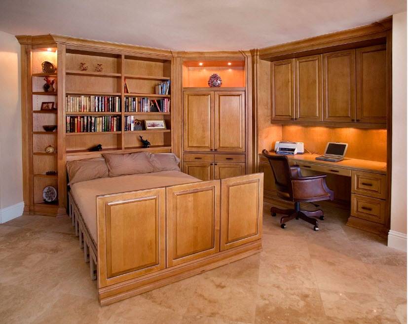 Еще одним нестандартным вариантом считают шкафы-купе с встроенной техникой или мебелью (телевизором, кроватью, компьютерным столом).