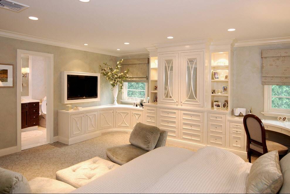 Радиусные угловые шкафы-купе, выполненные в классических цветах – подойдут к классической спальне. Роскоши добавят украшения с позолотой: рисунок или ручки шкафа.