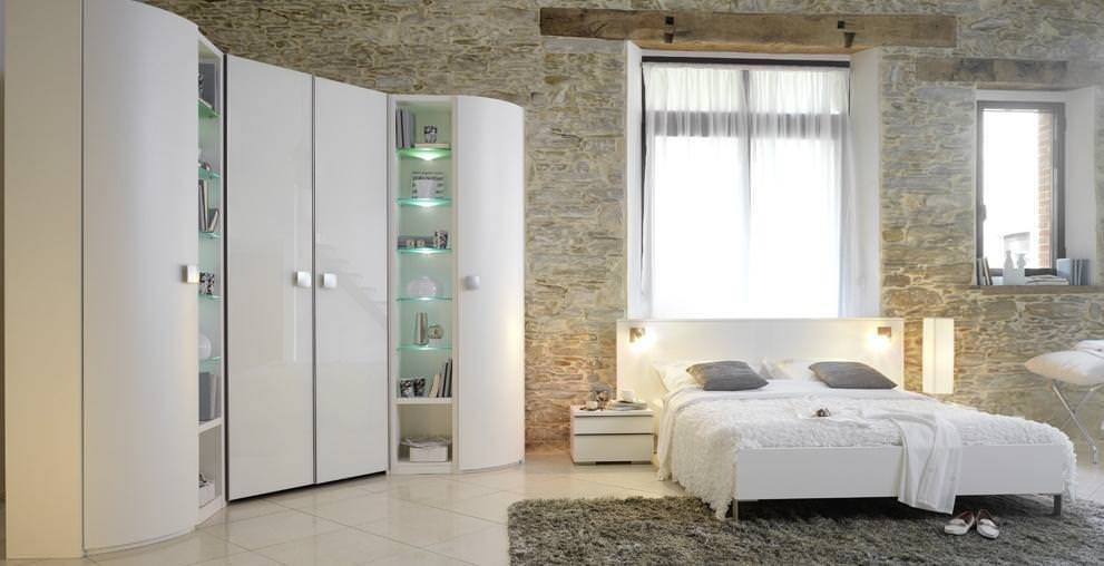 Радиусный. Подразделяется на вогнутые модели и выпуклые. Первые ненавязчиво создают дополнительный объем. По сути, служат модификацией треугольных шкафов. Вторые обыгрывают Г-образные силуэты. Мягкие линии хорошо вписываются в модерн, хай-тек, романтизм, эклектика.