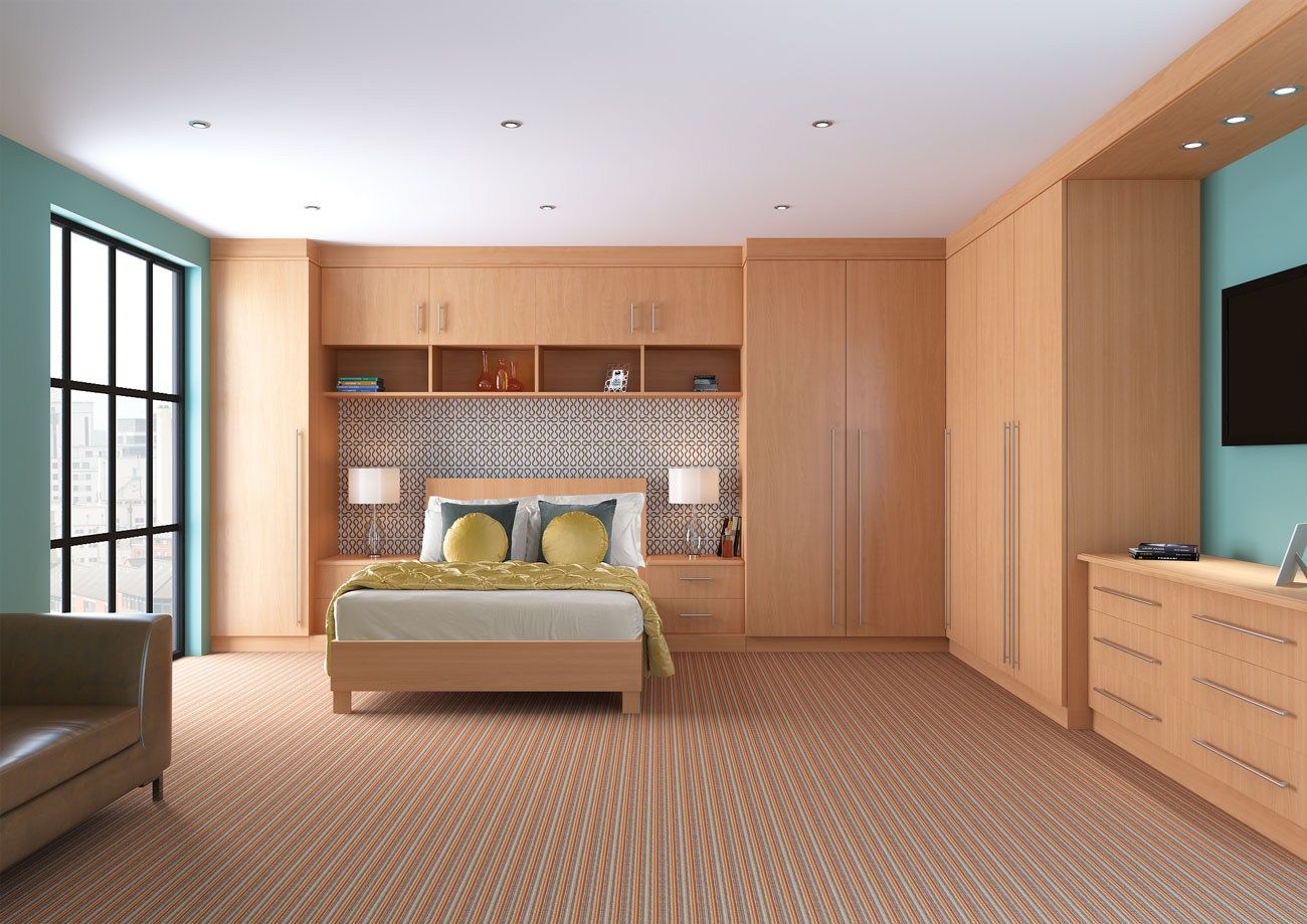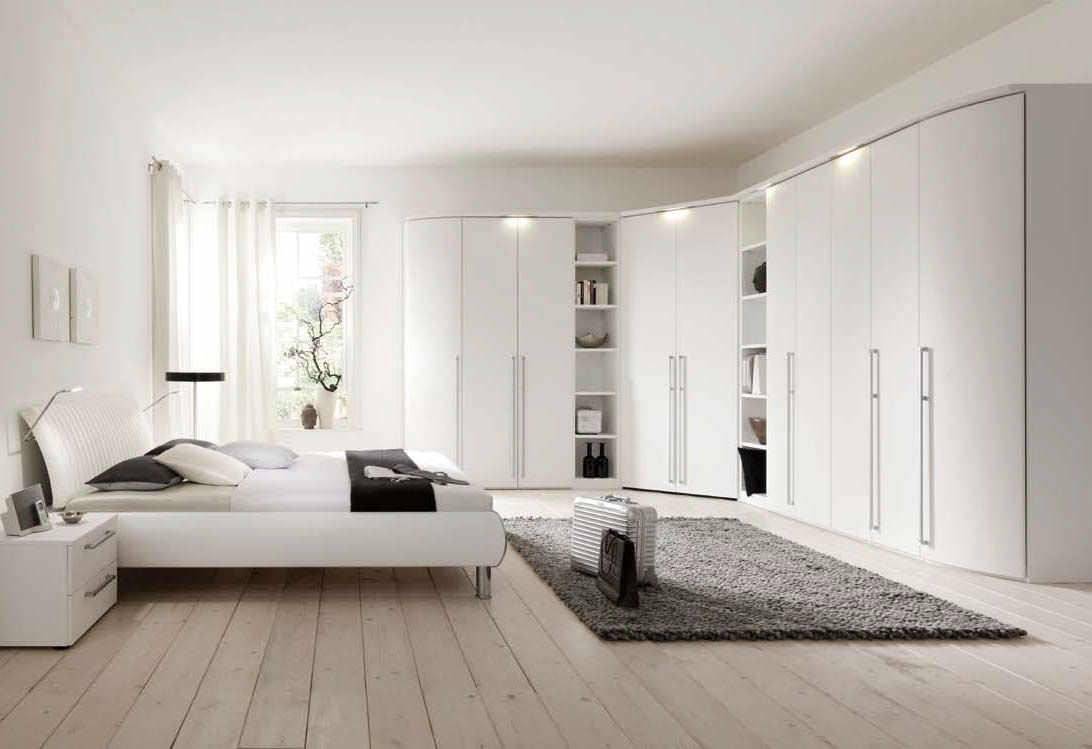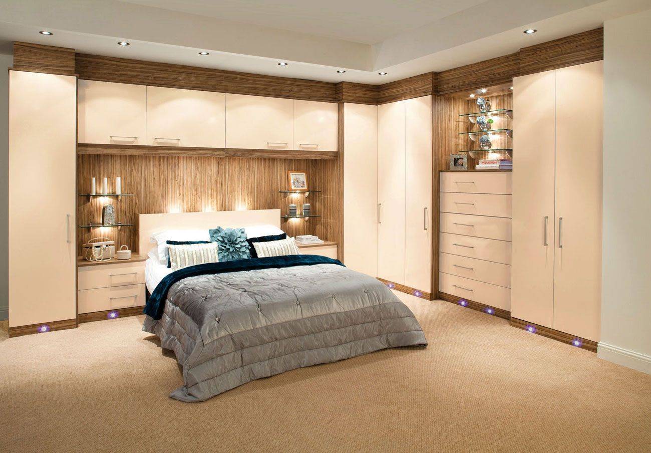 Г-образный. Две прямоугольные секции соединяются под прямым углом. Максимально вместительный вариант, который к тому же очень бережно относится к квадратным сантиметрам вашей спальни. Подходит для малогабаритных комнат, где каждый миллиметр на счету.