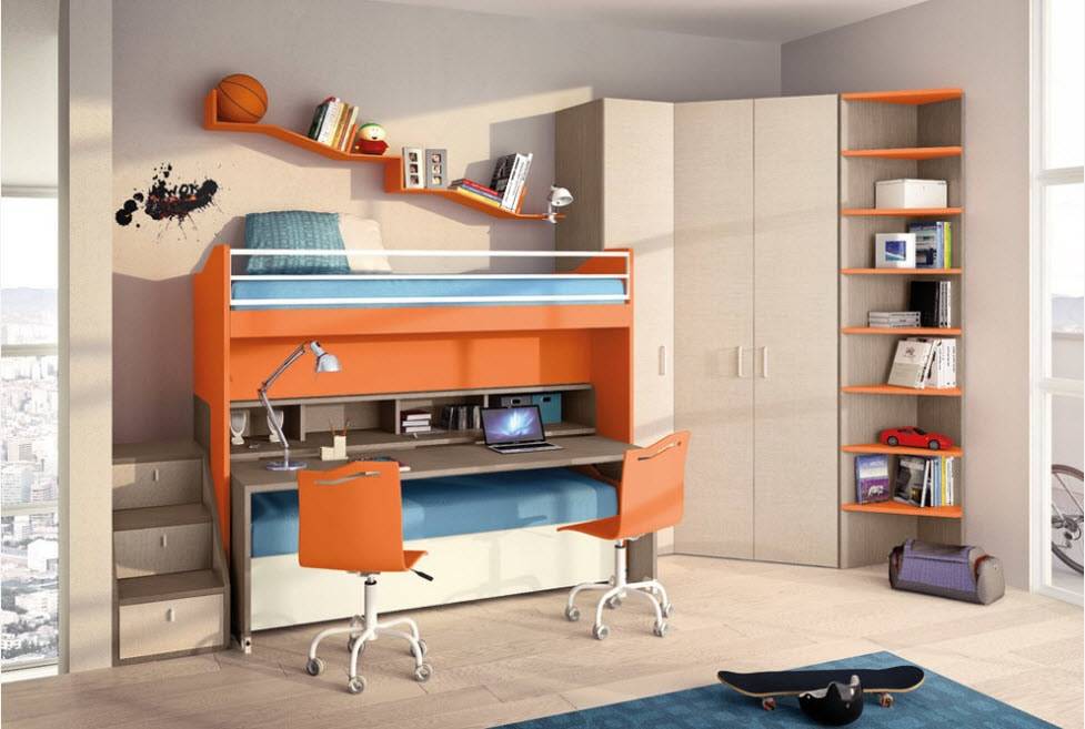 С антресолями. Иногда высота потолков позволяет сверху или сбоку шкафа расположить антресоли. При этом нужно учитывать, что не стоит их вешать над кроватью, поскольку модуль с вещами весит прилично. Лучше антресоли разместить на свободной стене. Например, над рабочим столом.