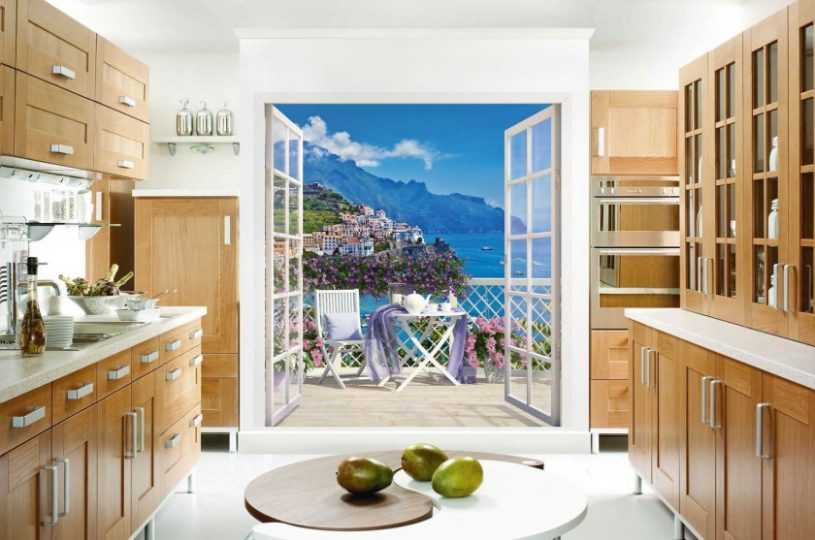 К прочим достоинствам таких фотообоев можно отнести возможность увеличения ограниченного пространства кухни, преображения уровня освещения, устойчивость красок к постоянному воздействию солнечных лучей, а также спокойную переносимость влаги – и, как следствие, легкую очистку от любых загрязнений.