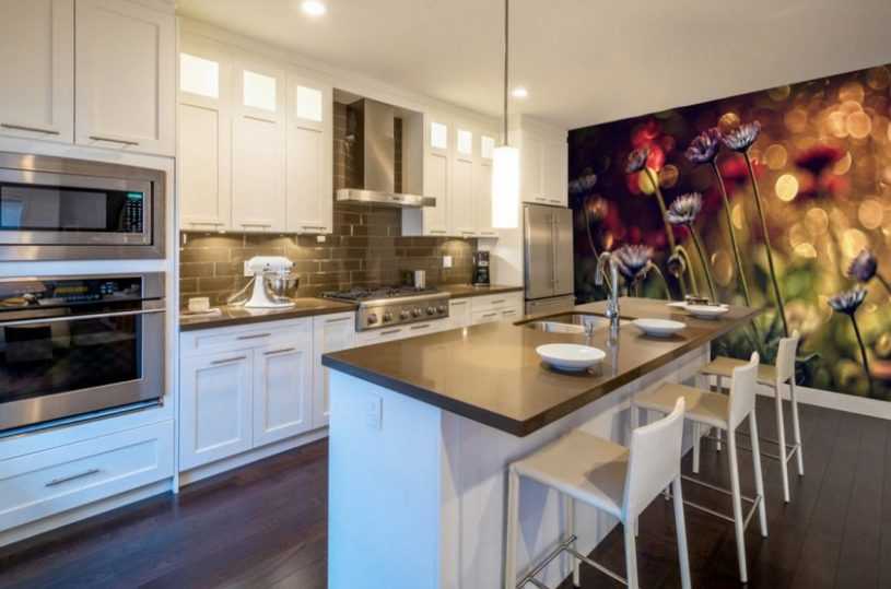 Совет: для кухни лучше выбирать фотообои на виниловой или флизелиновой основе или сделать сюжет на заказ, подобрав наиболее прочный и качественный материал.