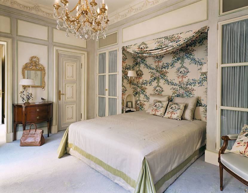 В пределах одного помещения может присутствовать кровать с металлическим изголовьем, украшенным коваными деталями, туалетные столики, размещенные в разных зонах спальни, удобное невысокое кресло (французы называют его «бержер») и шикарное зеркало в роскошном обрамлении.