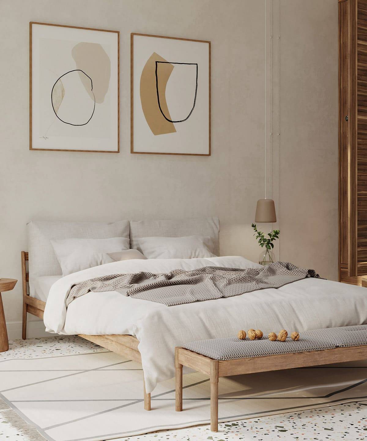 Современность и элегантность в стильный дизайн интерьера спальни 2022 можно привнести с помощью картин, размещенных на одной стороне кровати, или по центру