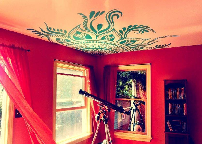 С помощью потолочных фресок можно зонировать комнату или объединить несколько зон в одну. Использование росписи на стенах и потолке поможет грамотно разграничить пространство в гостиных, совмещённых с кухней, столовой, спальней, детской и пр.