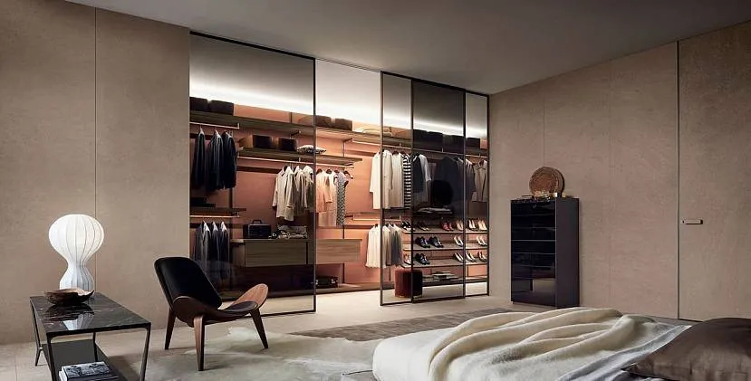 Гардероб за дверями из стекла можно расположить даже за кроватью