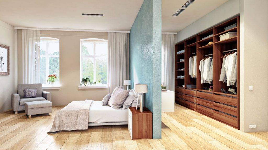 Зонирование спальни при помощи гардеробной
