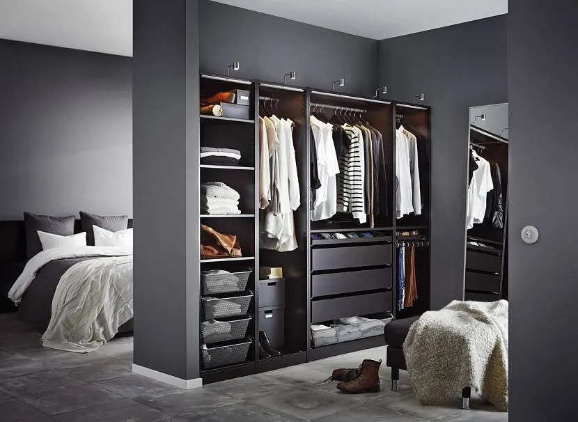 Конечно, закрытые гардеробные системы хороши тем, что возможный беспорядок будет надежно спрятан за дверями, но если места катастрофически мало, лучше не использовать перегородки, ширмы, створки и прочие разделители, а ограничиться четкой системой полок и вешалок.