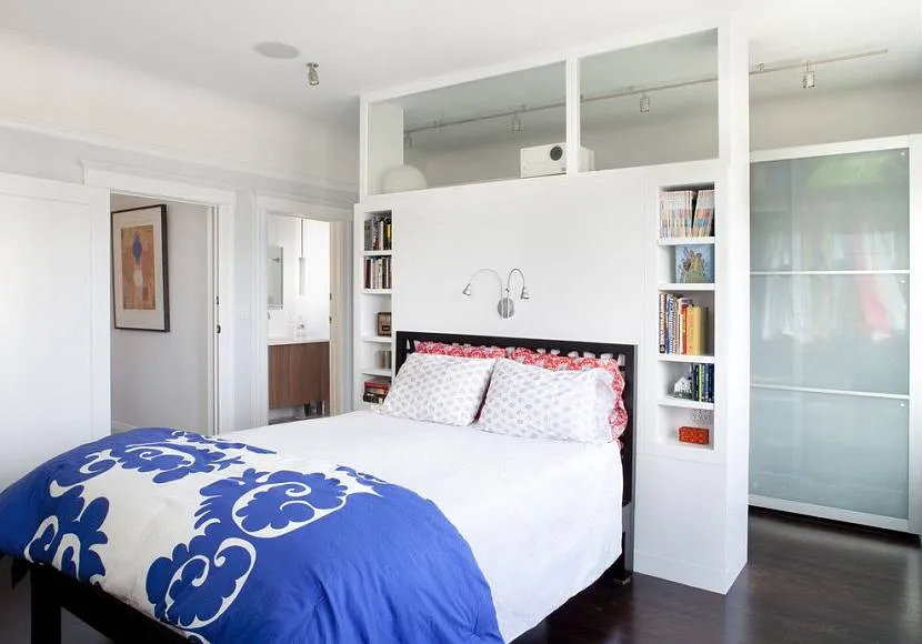 - Сквозным – с двумя дверцами, расположенными с обеих сторон кровати. В этом случае достаточно сделать перегородку от пола до потолка и оставить 2 выхода.