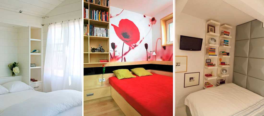 Для полок можно использовать любое свободное пространство. Особенно хороши ниши, в нижней части которых можно разместить закрытые шкафы, в верхней – открытые полки. Тогда не понадобятся прикроватные тумбочки, сэкономится ценное место.