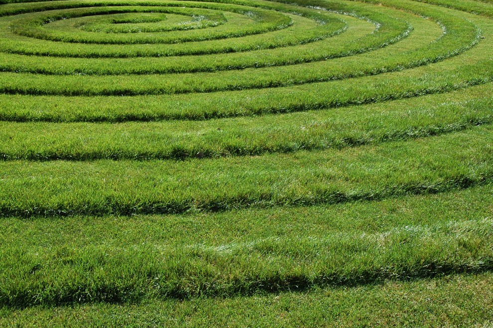 Декоративный прием стрижки газона: передвигаясь с газонокосилкой концентрически. Идеально ровных кругов или спиралей можно добиться, закрепившись к центральной надежной опоре тросом)