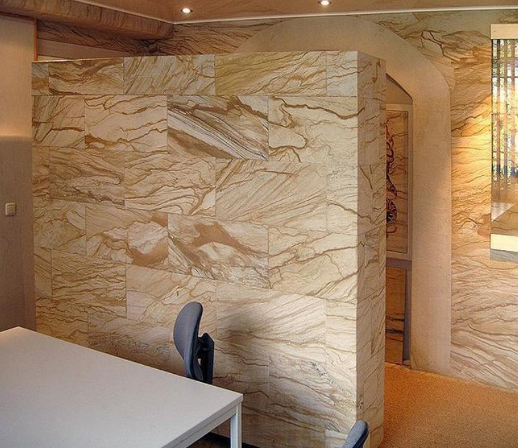 Смотрится гибкий камень в интерьере очень благородно и эффектно. Цветовая палитра достаточно многогранна и может начинаться от светло-бежевых и бело-серых тонов самого песчаника и заканчиваться розовым и желтым.