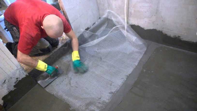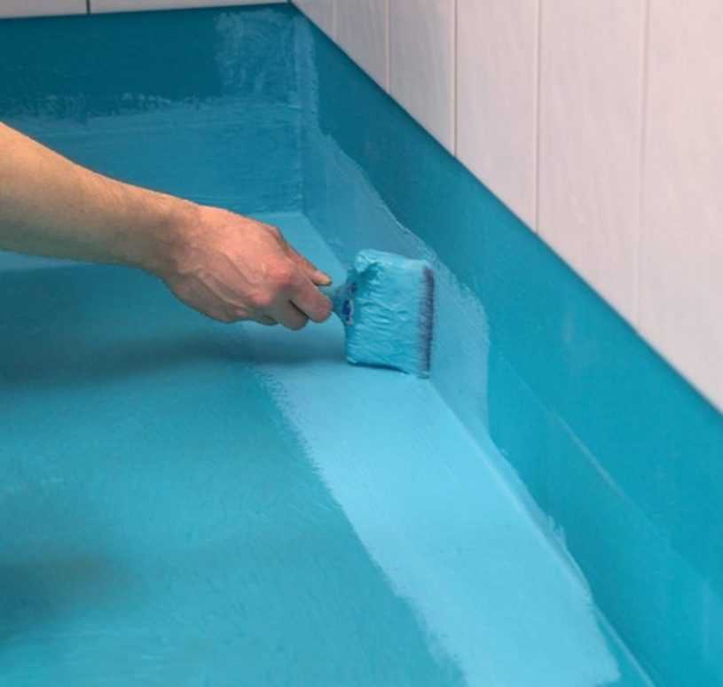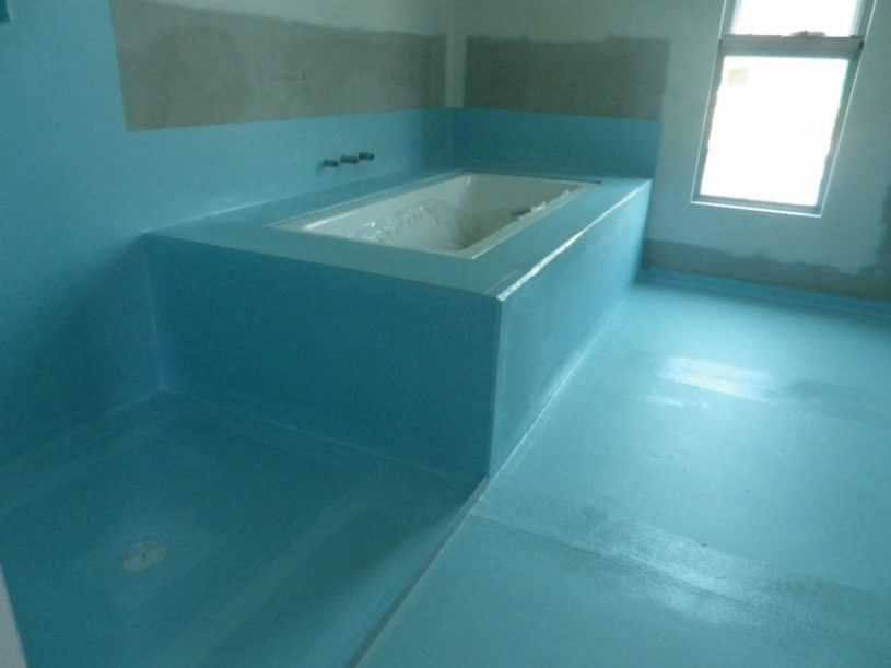 Защитное покрытие наносится на бетонное основание и на низ стен высотой около 10-20 сантиметров дополнительной формируется гидроизоляционный фартук на стене, у которой устанавливается ванная.