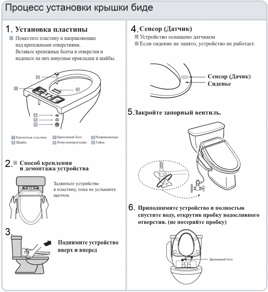 Такой комплект ставится на унитаз. Он не нуждается в дополнительном месте, а потому установка не требует дальнейшего косметического ремонта. Но для монтажа крышки-биде нужно соблюдение определенных правил: