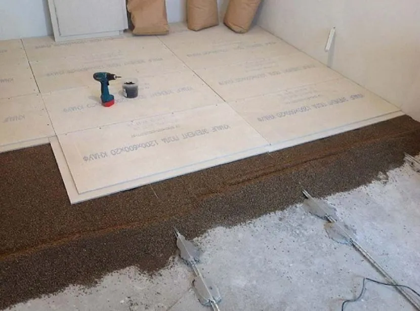 После выравнивания слоя керамзита можно укладывать на пол листы гипсокартона