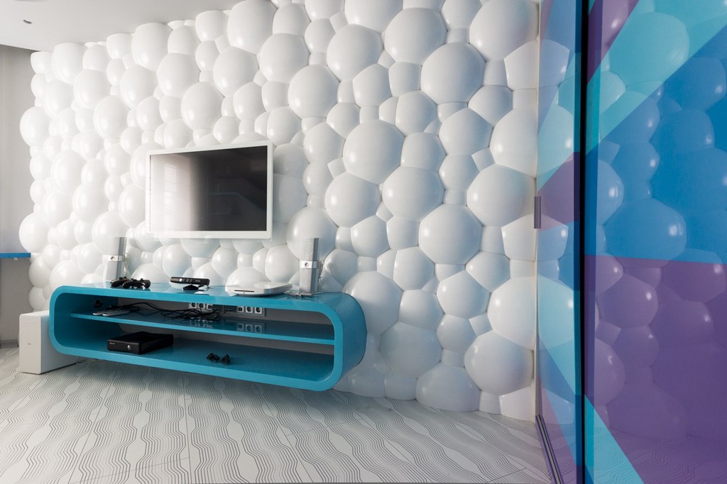 - Не подходят для монтажа в помещении с маленькой площадью. В связи с тем, что трехмерный фактурный рисунок визуально уменьшает площадь помещения, 3Д панели для стен в интерьере маленькой комнаты неуместны, так как они еще больше сократят пространство. Если все же есть желание использовать 3 D панели, то рекомендуется декорировать только одну из стен. Например, центральную, часть стены у камина, возле телевизора или у изголовья кровати. Это тоже может быть очень эффектно, изящно и со вкусом.