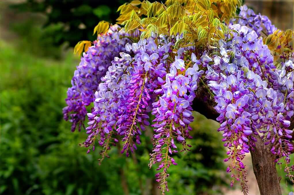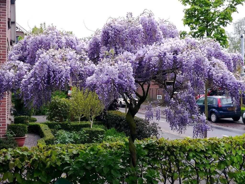 Взрослое дерево глицинии имеет разные формы. Это может быть дерево с мощным стволом или плетущаяся лиана, постепенно захватывающая окружающее пространство вашего сада.