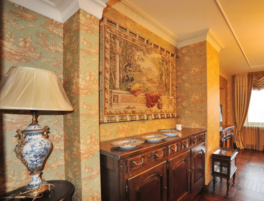 Картины из гобелена сделают комнату более добротной. Если гостиная большая, то лучше для подчеркивания симметрии, которой характерна классика, повесить две картины.