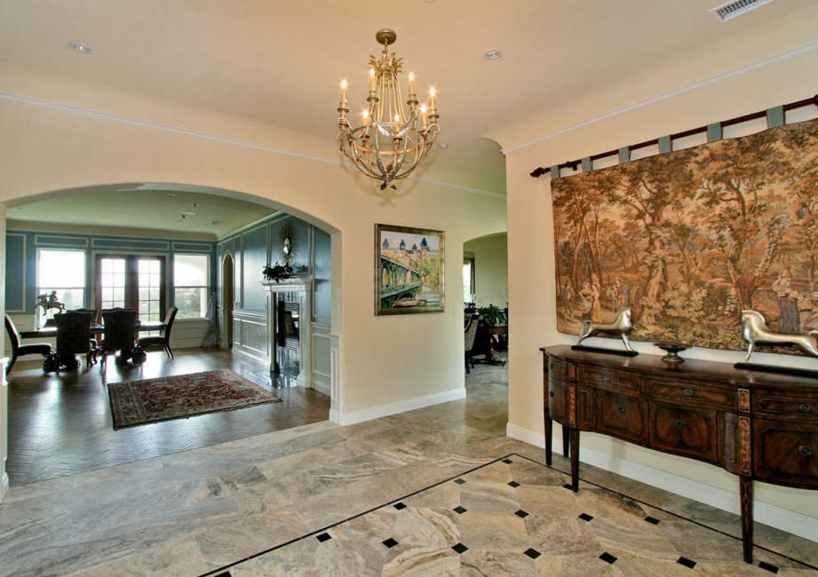 Художественность классического стиля можно подчеркнуть за счет панно в теплой золотистой, травяной или серебристой гамме. Гипсовые, зеркальные, тканевые, ажурные кованые или резные деревянные изделия, гобелены и другие украшения, не будут резко выделяться из общего интерьерного решения.