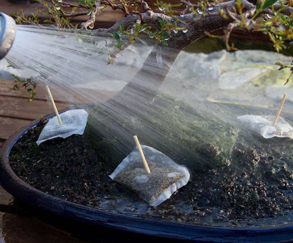 - Сверху засыпаем бонсай свежим грунтом при необходимости уплотняя его.