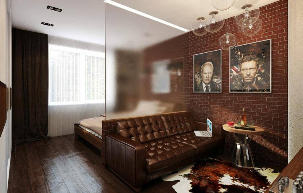 Самым простым способом организовать зоны спальни и гостиной в одной комнате это визуально их отделить, например обоями. Разделение зон нужно делать не только цветом, но и фактурой настенного покрытия. Кроме обоев можно применить декоративную шпаклевку, отделку с элементами деревянных панелей, пластика, шелкографии. Не менее оригинальным может стать вариант устроить себе спальную зону, изменив размер подоконника. Данный способ подойдет, если качество окон безупречно, размеры самого владельца этой спальни должны быть тоже небольшие. Если в комнате есть балкон, то можно устроить на нем спальное место или кабинет. Организовать комфорт зоны отдыха в маленькой комнате можно при помощи штор. Выбор занавесок зависит от приоритетов собственника квартиры. Солидности и тяжести, мужскому интерьеру, придадут шторы коричневых, горчичных и кофейных тонов. Лучше, если это будут шторы, пошитые из тяжелой гардинной ткани.