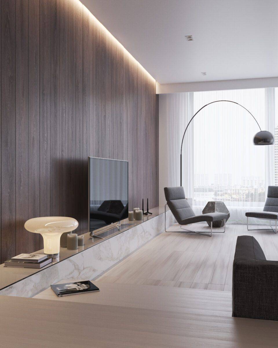 Особенно это важно для небольших квартир, поскольку такой дизайн интерьера будет способствовать отсутствию ощущения давления. Благодаря простым формам, нейтральным цветам и открытым горизонтам, комната вызывает чувства умиротворенности и спокойствия