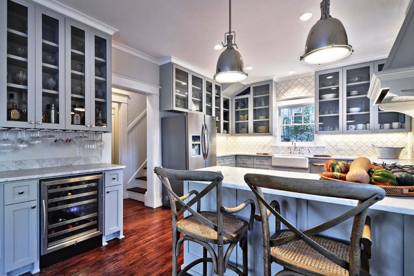 Так как стиль изначально зародился на берегах средиземного моря, на фото кухонь в стиле кантри и прованс часто можно увидеть светло-синие и холодные голубые оттенки. Причем эти цвета уместно использовать как для стен, так и для фасадов.