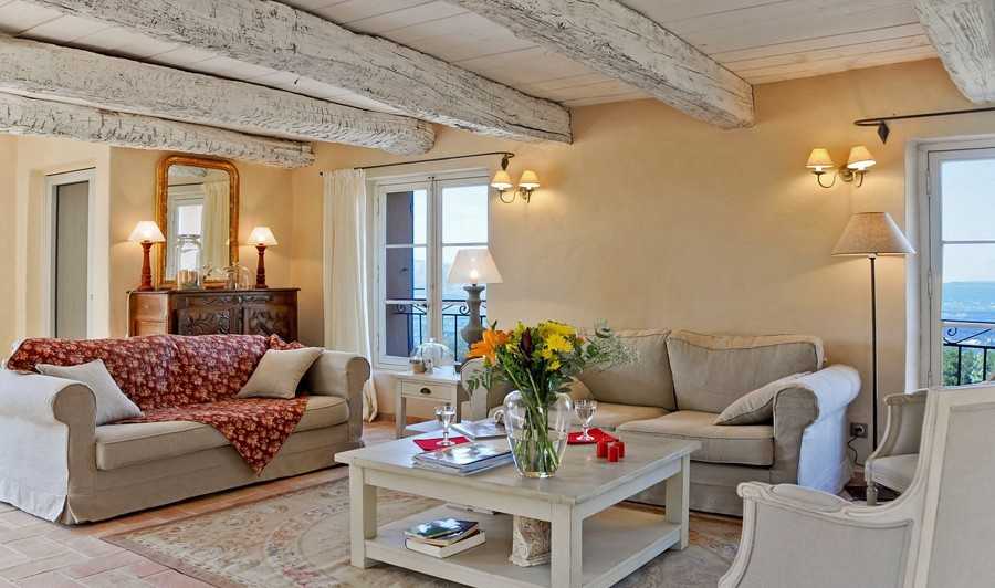 Солнечную атмосферу можно еще больше подчеркнуть, если правильно подобрать цвет стен. Гостиная в провансальском стиле основана на светлых и пастельных тонах. Стенки малого и менее освещенного солнцем интерьера могут быть окрашены в белом и экрю. Выбрав этот тип пастельных оттенков, вы улучшите визуальные пропорции помещения. Яркая стена также будет отражать больше солнечного света, что приведет к лучшему освещению комнаты.