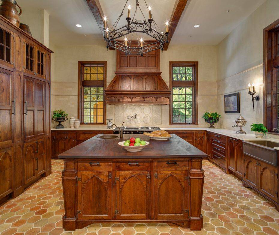 На пол можно положить керамическую плитку с интересными растительными узорами или деревянную доску дорогой породы. Для освещения в кухне обычно используется люстра, подвешенная на потолке при помощи цепи. Лучше если она будет кованная и со светильниками в виде свечей. Необычным элементом на кухне станет кованный подсвечник в виде дракона.
