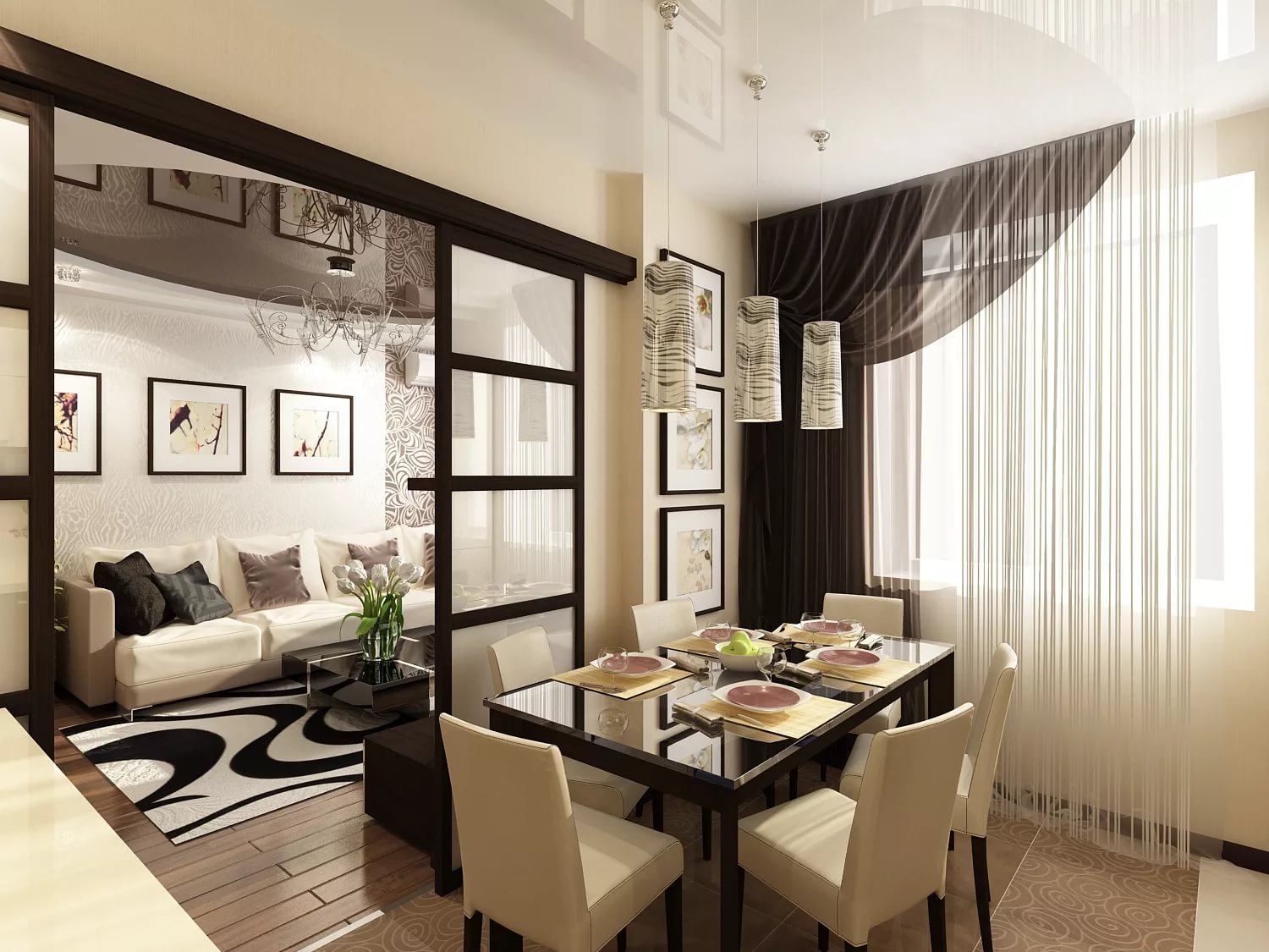 Дизайн больших студий не обходится без декоративных ширм, перегородок или стеллажей. Они могут быть изготовлены из стекла, гипсокартона, дерева или просто ткани. Для функциональности перегородку можно выбрать с нишами для аквариума, книг, ваз или посуды. Подобные конструкции станут настоящим украшением любого интерьера, сочетая в себе красоту и практичность. Раздвижные двери с роликовым механизмом позволят гостям не наблюдать за процессом приготовления пищи. Кроме того, благодаря этому в гостиную не будут проникать посторонние и не всегда приятные запахи.