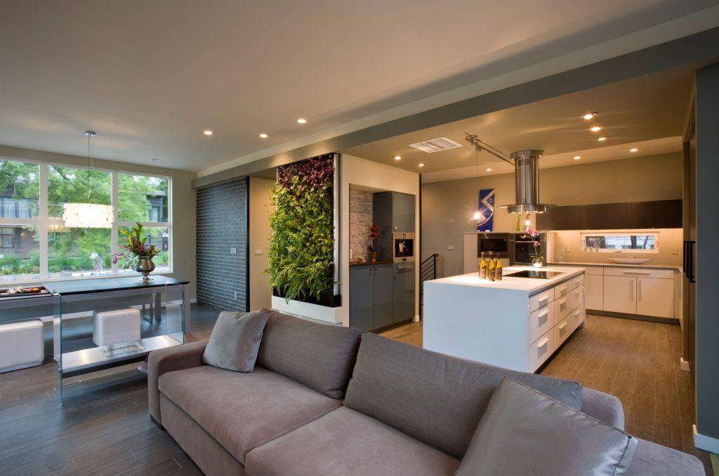 Наиболее распространенные решения в этом типе договоренности — зонирование кухни и гостиной. Это можно сделать, правильно расставив мебель. Границей может быть диван, кухонный остров, бар или стол. Стеклянные и складные стены, например, гармошка, также все чаще встречаются. Другой вариант установить границу — изменить напольное покрытие, сочетая дерево в гостиной с плиткой на кухне.