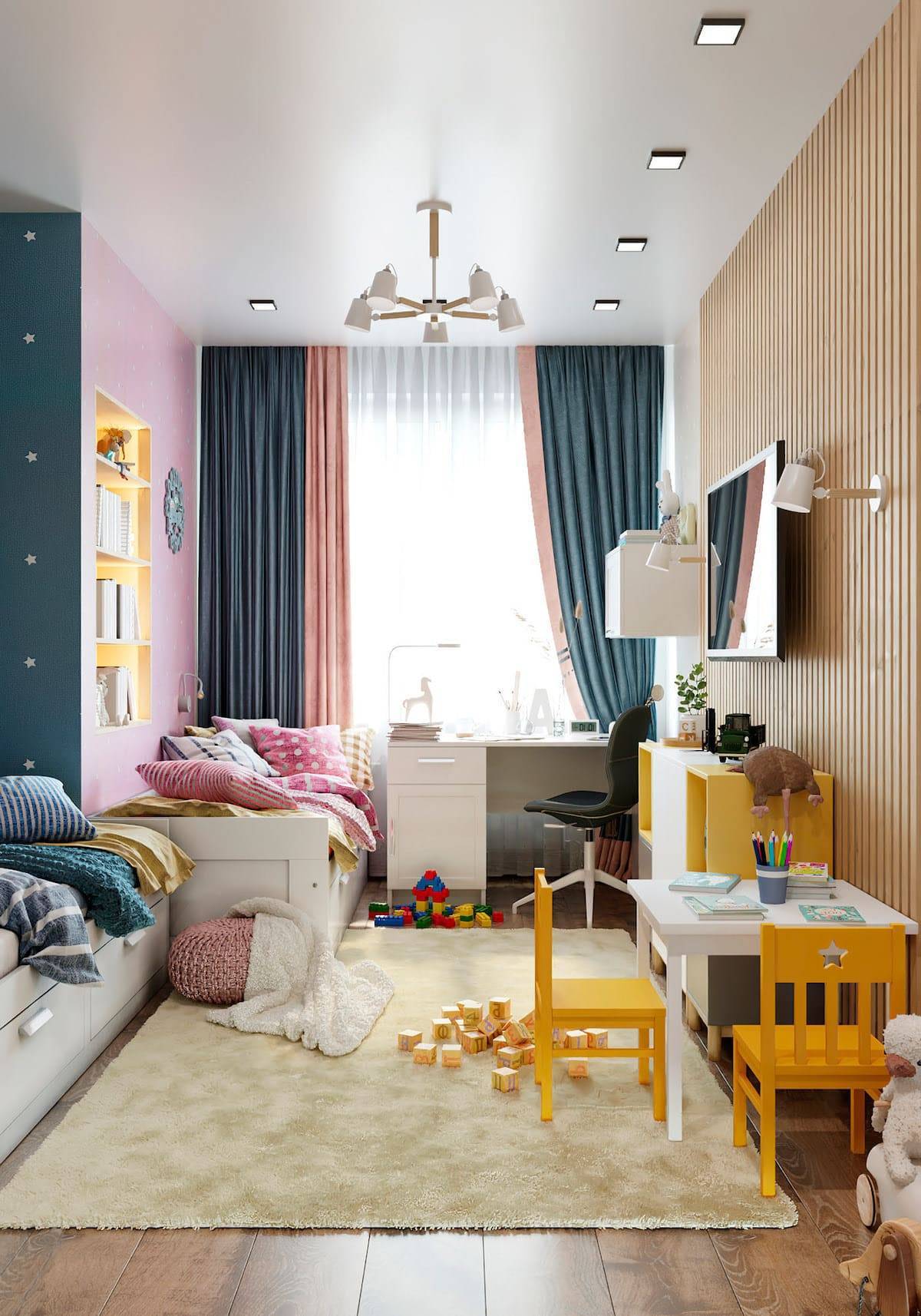 Помещение можно разделить на учебно-игровую и спальную с помощью ширм, мобильных перегородок или невысокого подиума. Из мебели для узких комнат подойдут трансформеры, экономящие пространство.