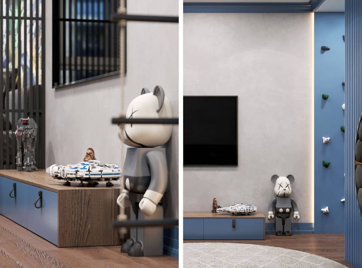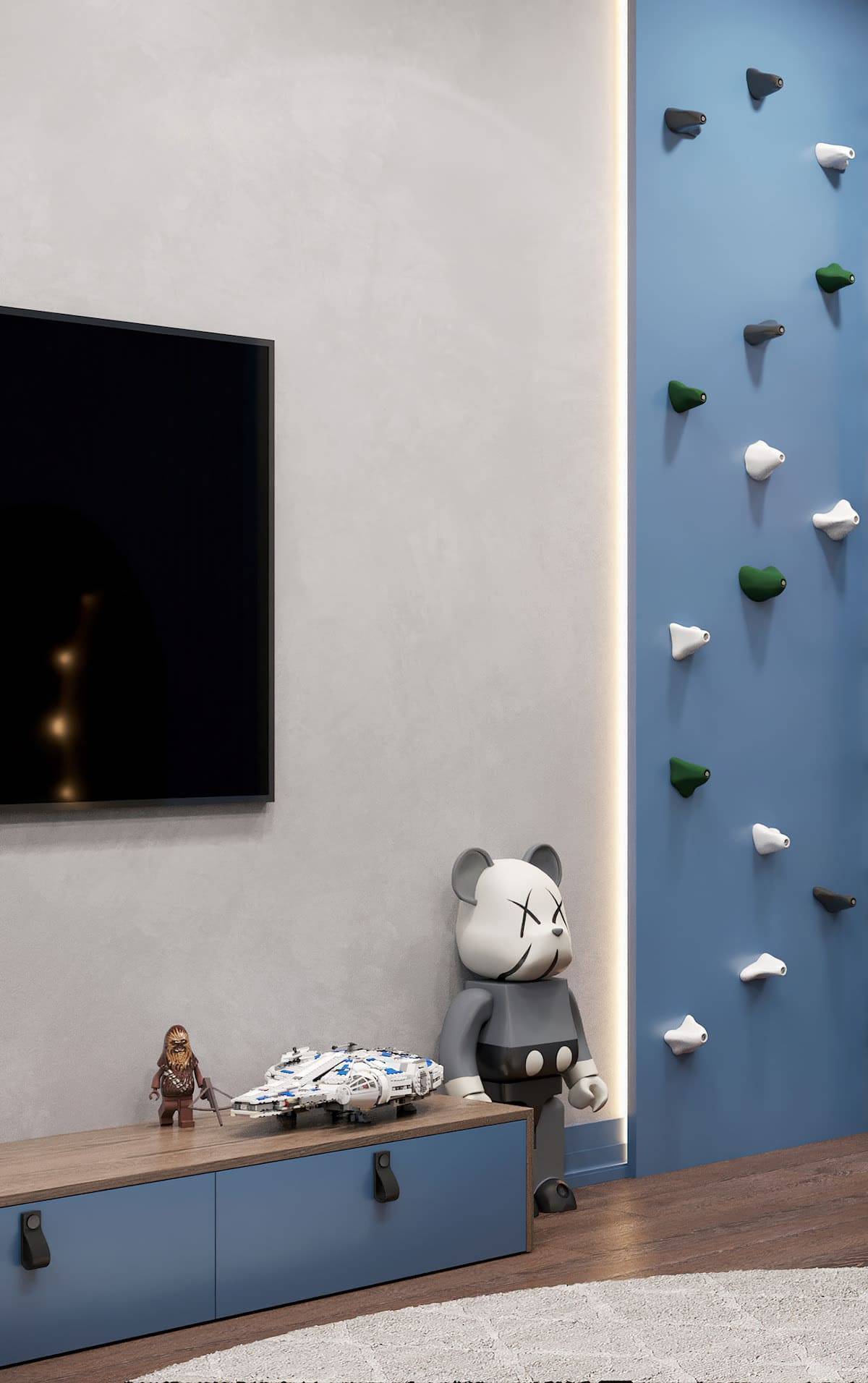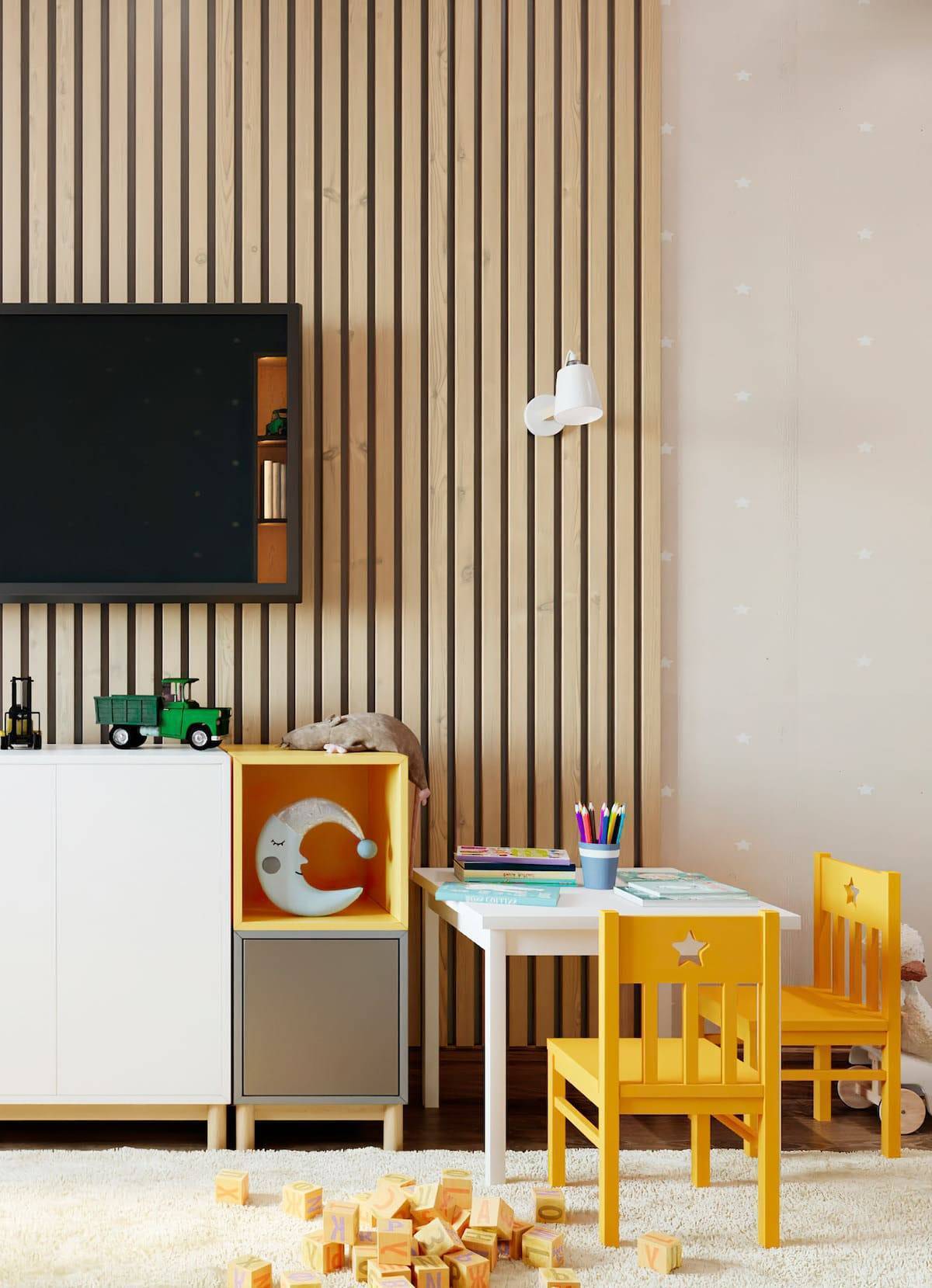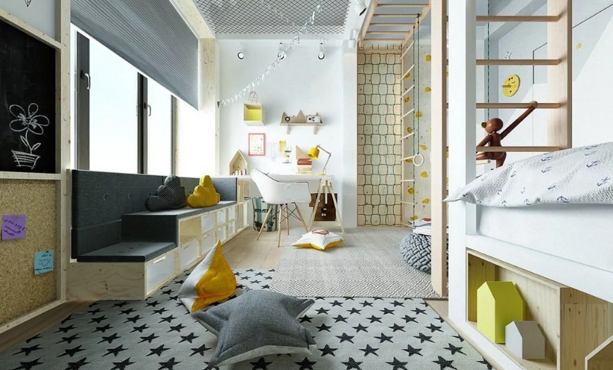 - свободное пространство для развития — стол и стул пока не нужен, зато пригодится возможность рисовать на стене (для этого часть стены оформляется маркерной доской).