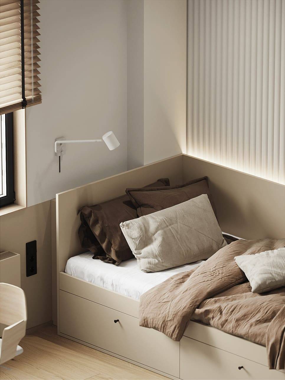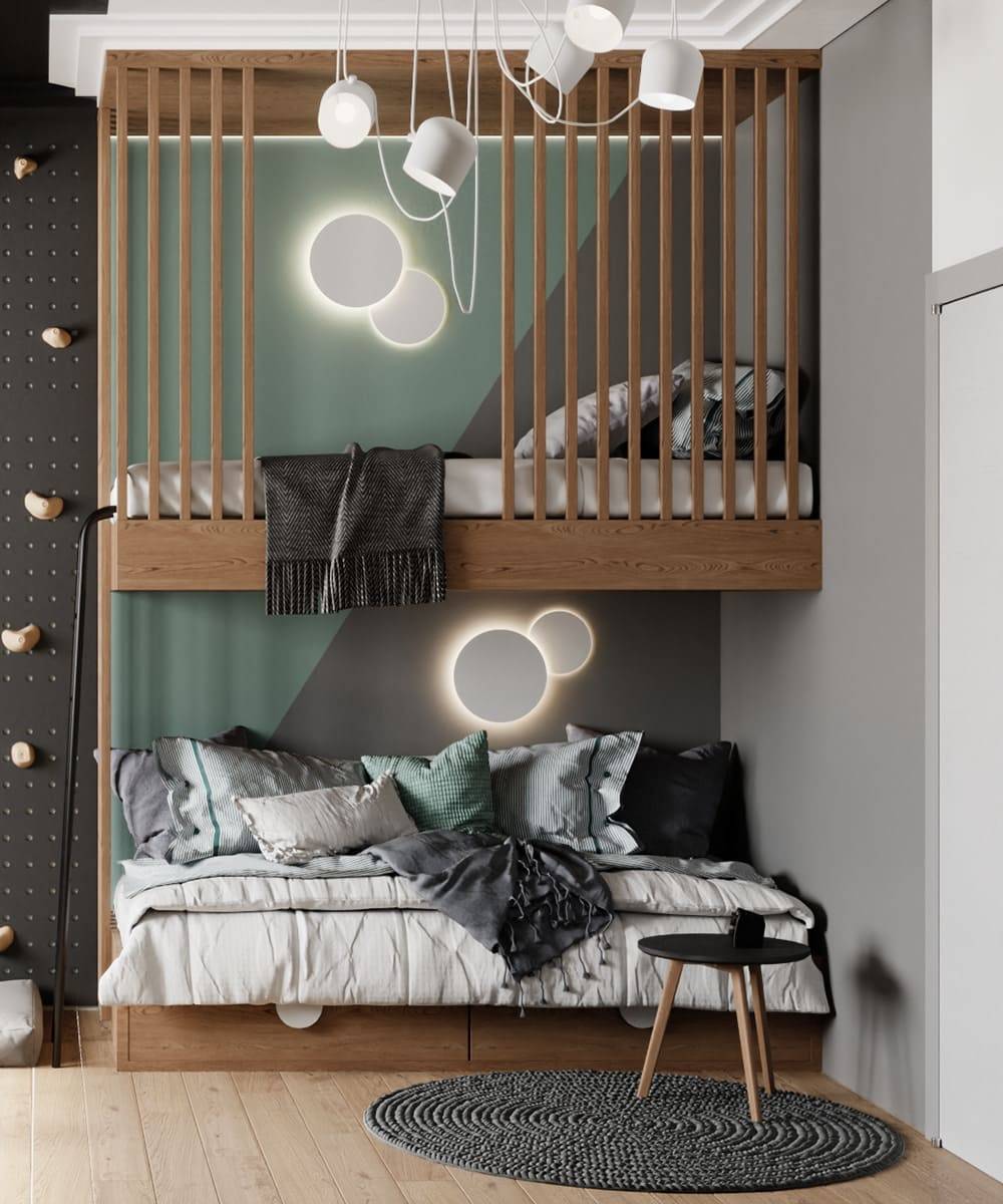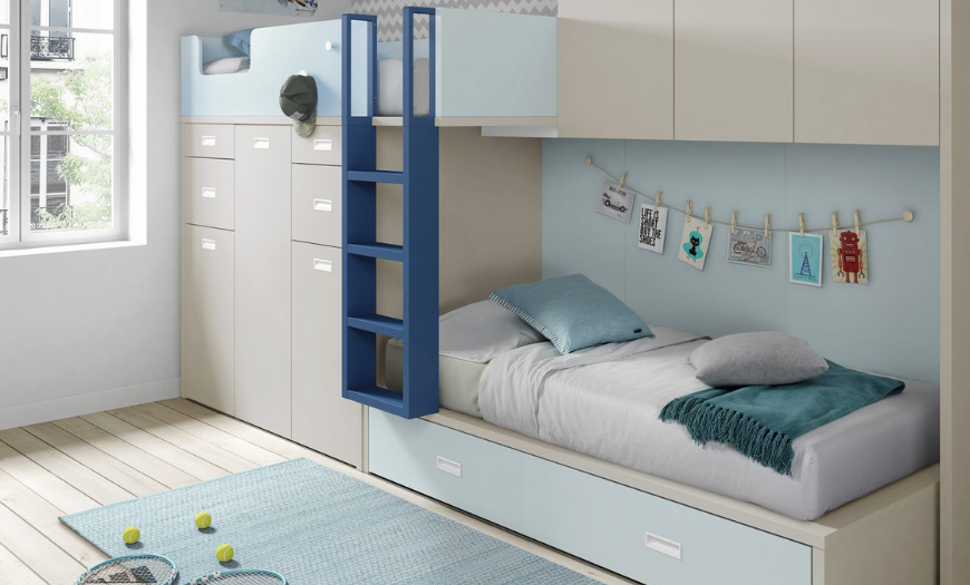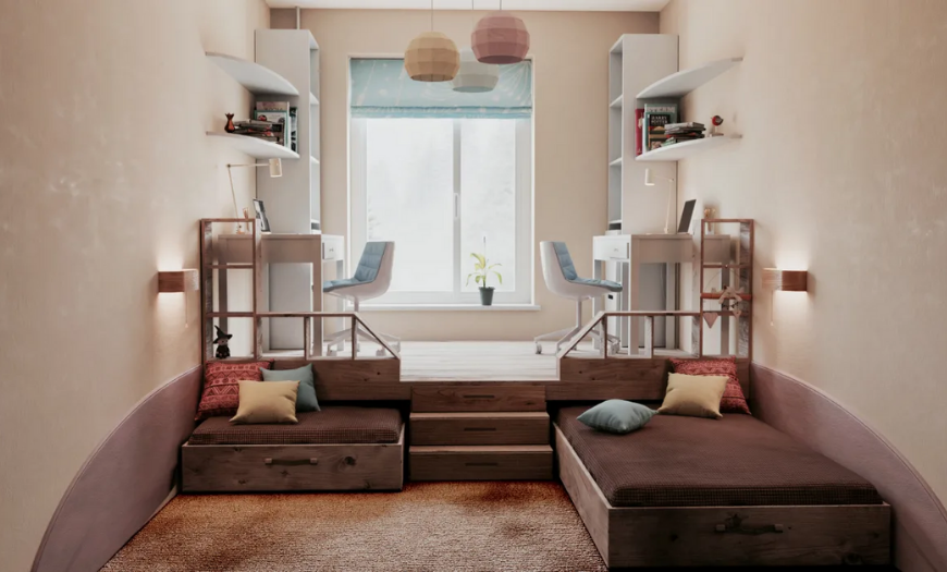 Если комната не обладает большими размерами, в ней предлагается установить спальный угловой комплекс, в котором две кровати располагаются наверху. Под одной из них ставятся ящики и полки, а под второй организуется место для дивана. Данный подход обеспечивает предотвращение споров касательно сна и создает возможности для экономии внутреннего пространства.