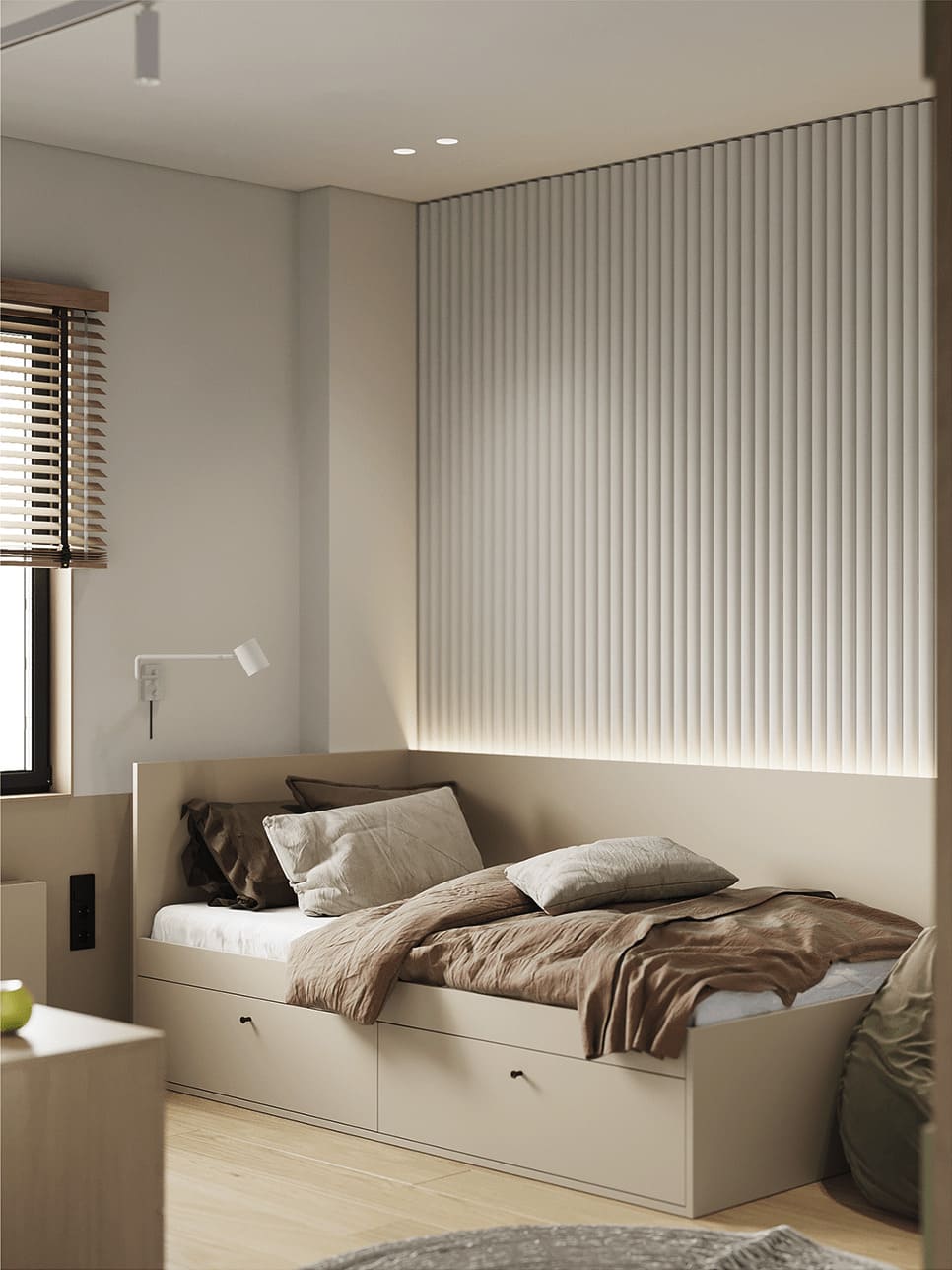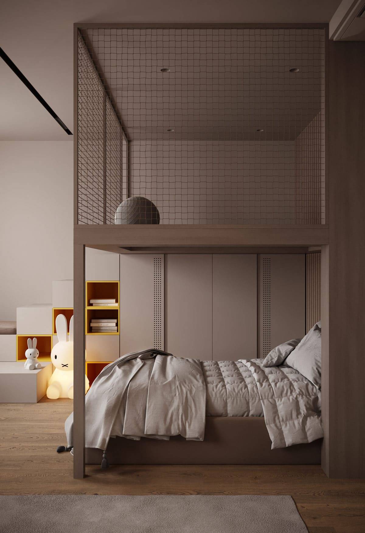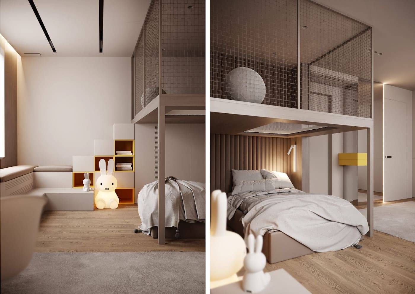 Если комната не обладает большими размерами, в ней предлагается установить спальный угловой комплекс, в котором две кровати располагаются наверху. Под одной из них ставятся ящики и полки, а под второй организуется место для дивана. Данный подход обеспечивает предотвращение споров касательно сна и создает возможности для экономии внутреннего пространства.
