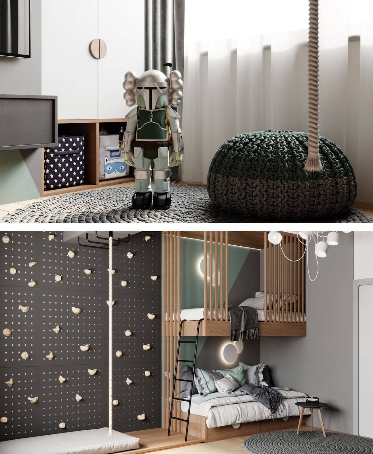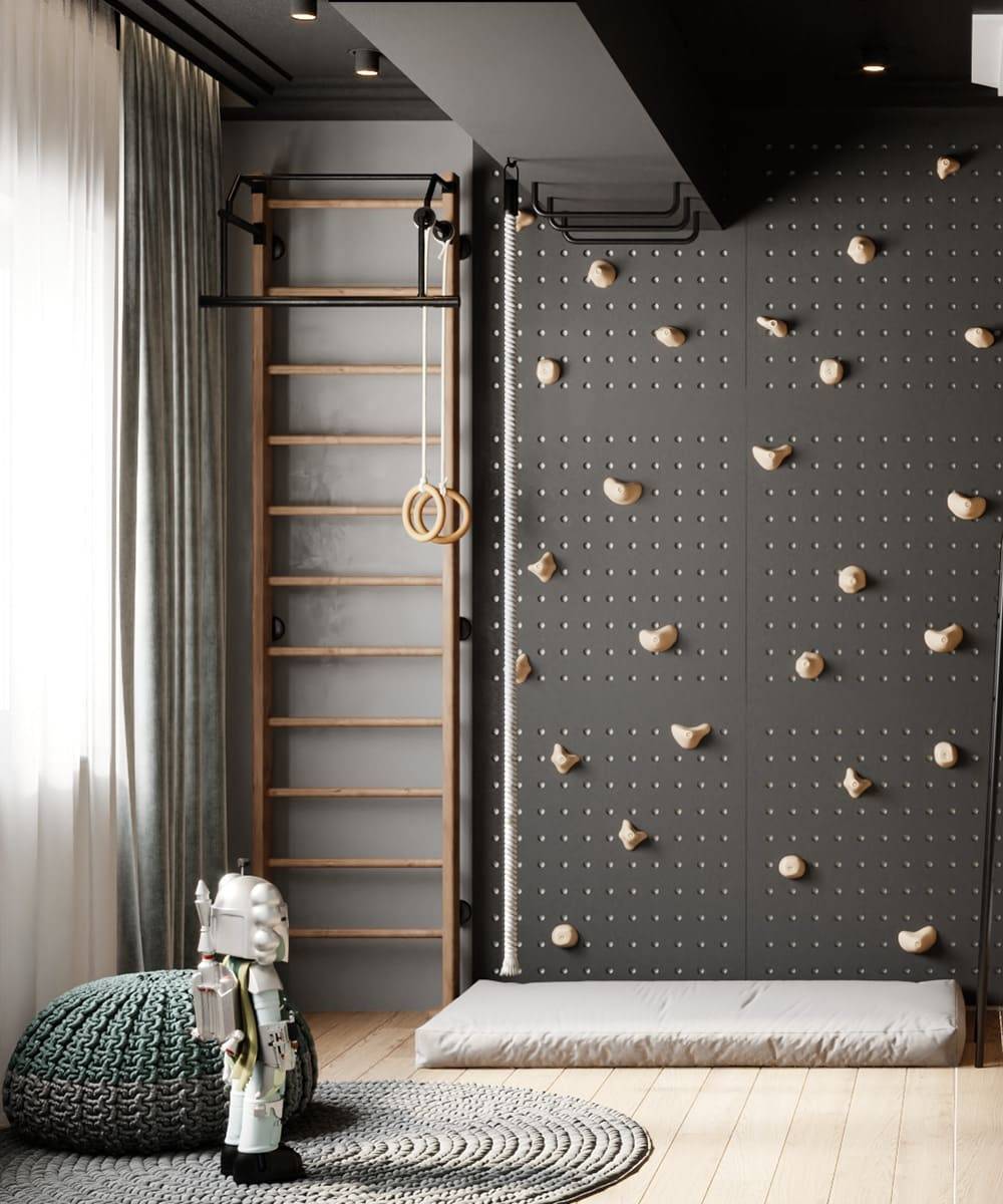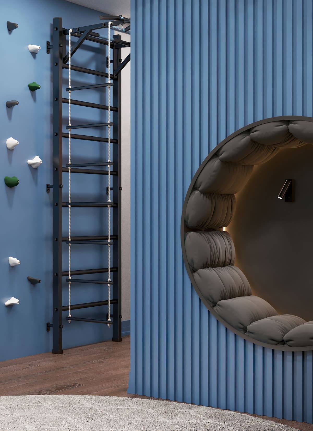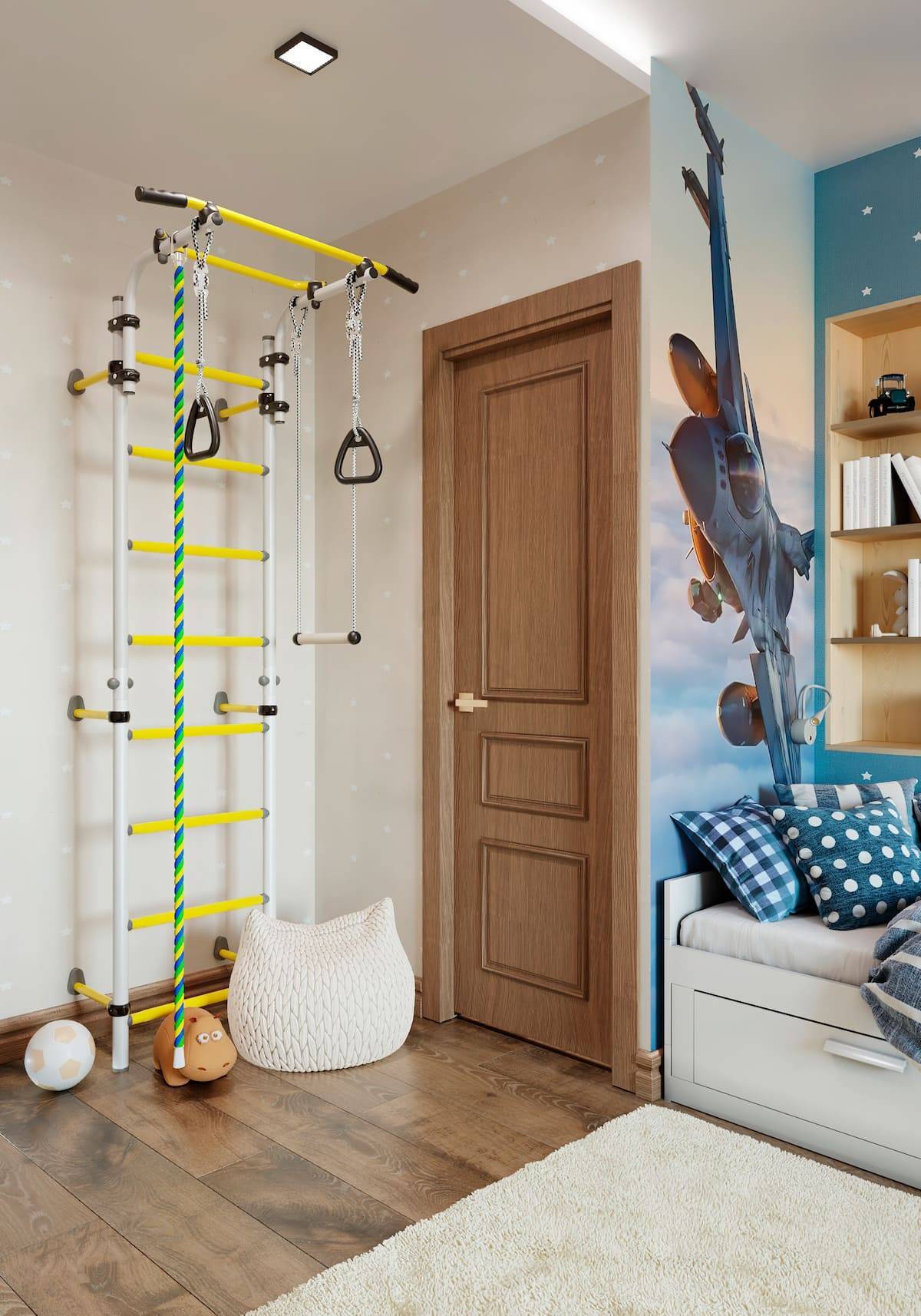 В центре комнаты — спортивный уголок — необходимый элемент детской для правильного физического развития ребенка.