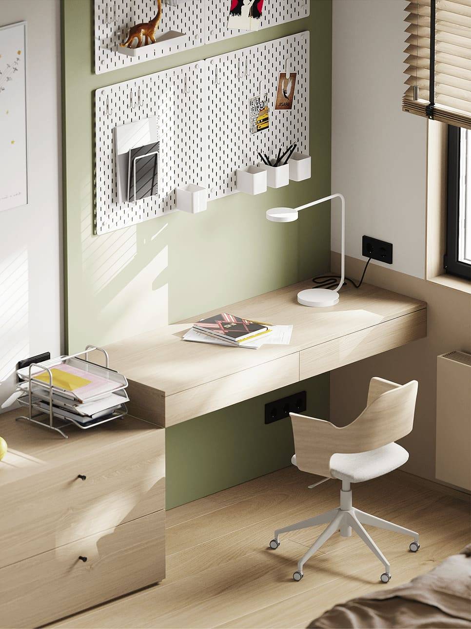 В возрасте от 7 лет необходимо учесть, что потребуется не только организовать место для выполнения домашних заданий, но и создать комфортную обстановку, которая не будет отвлекать ребенка. Становятся актуальны разбавленные оттенки светлых тонов.
