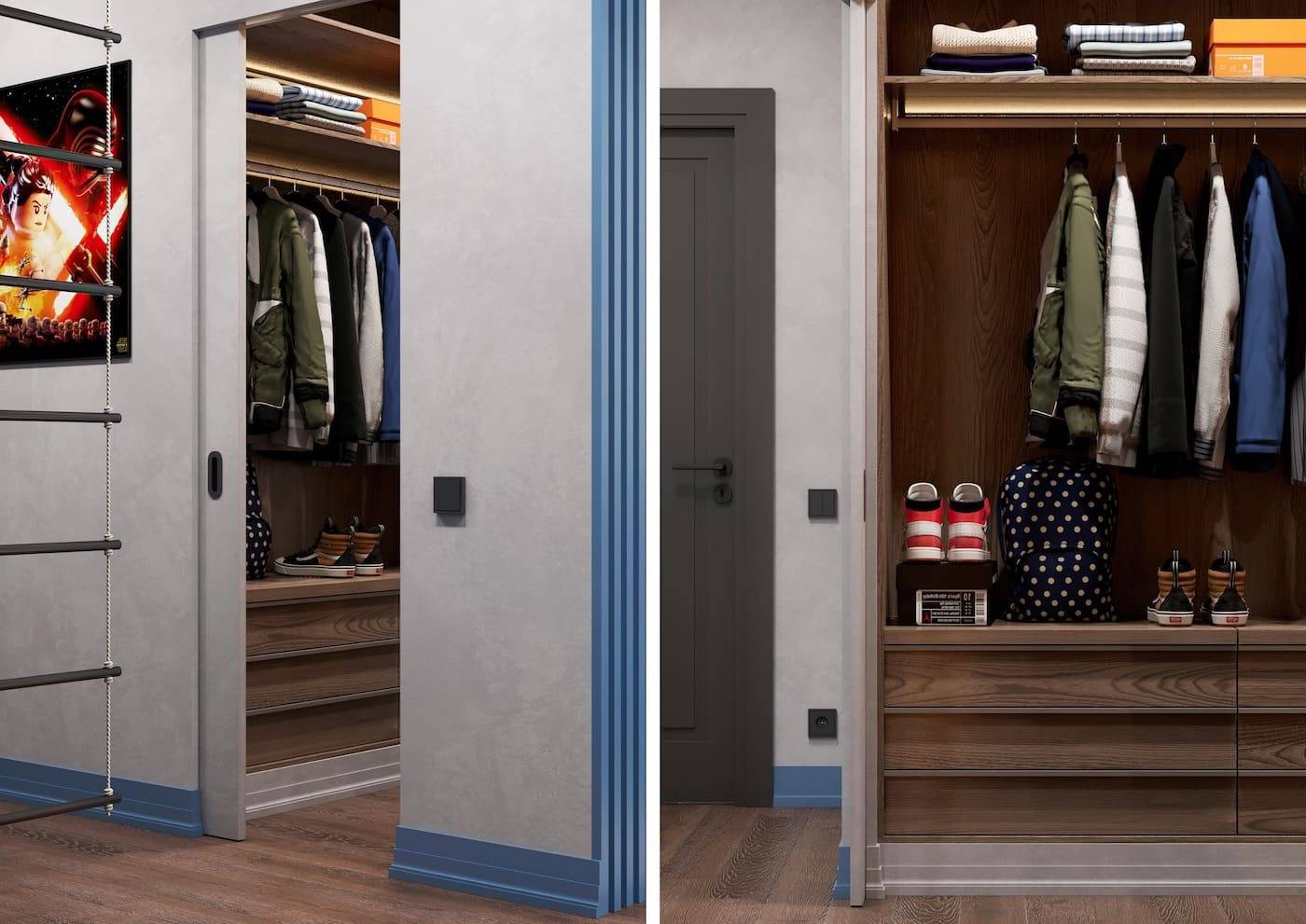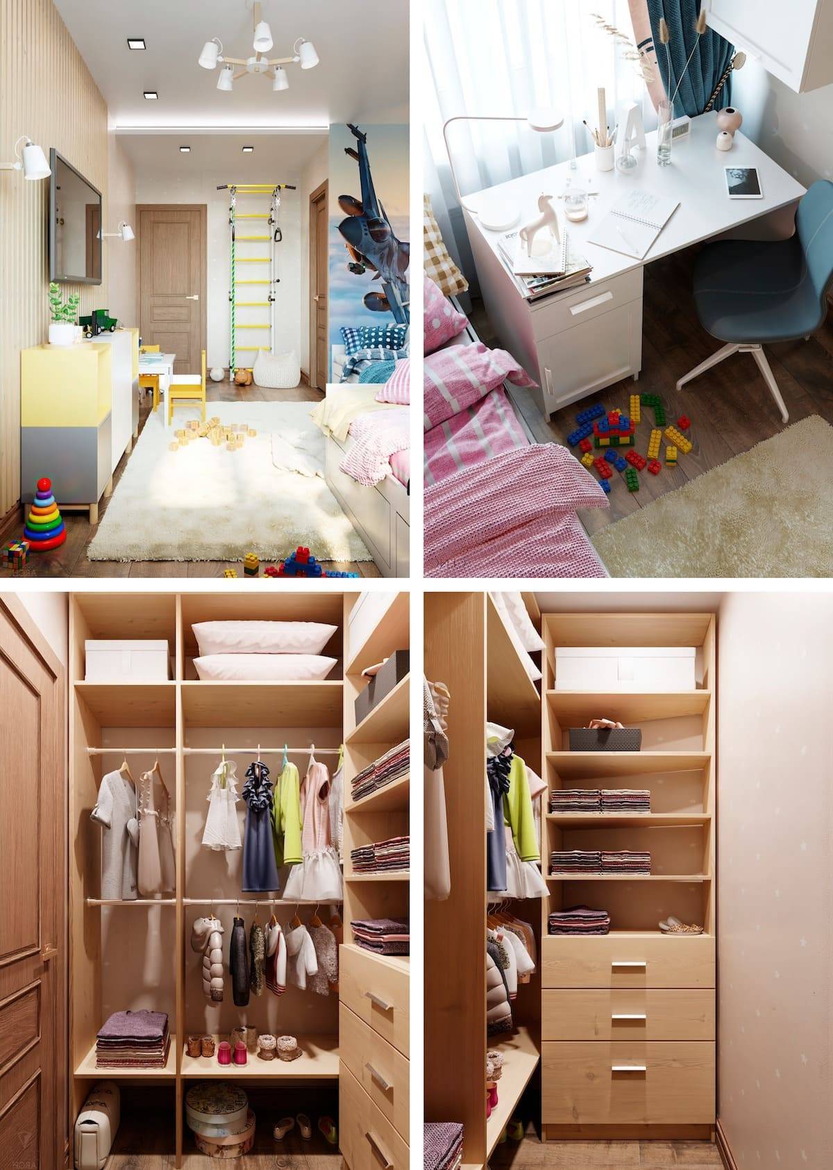Проблема, связанная с хранением вещей, также выносится на первый план. Часть одежды и постельное белье может размещаться в ящиках под кроватью. Но приобрести высокий шкаф-купе будет необходимо. В него будут положены все вещи, которые требуются для хранения в детской комнате. При невозможности поставить шкаф в детской комнате для этих целей можно использовать коридор (если его размеры позволяют это сделать). В комнате же нужно оставить как можно больше свободного пространства.