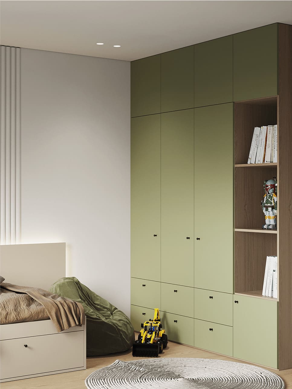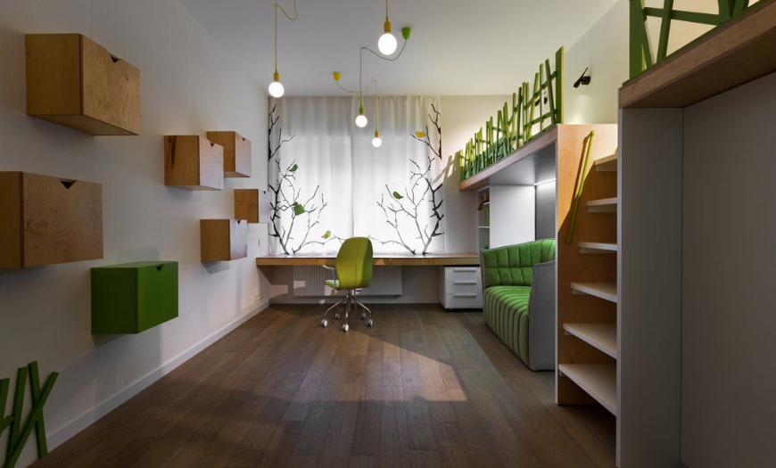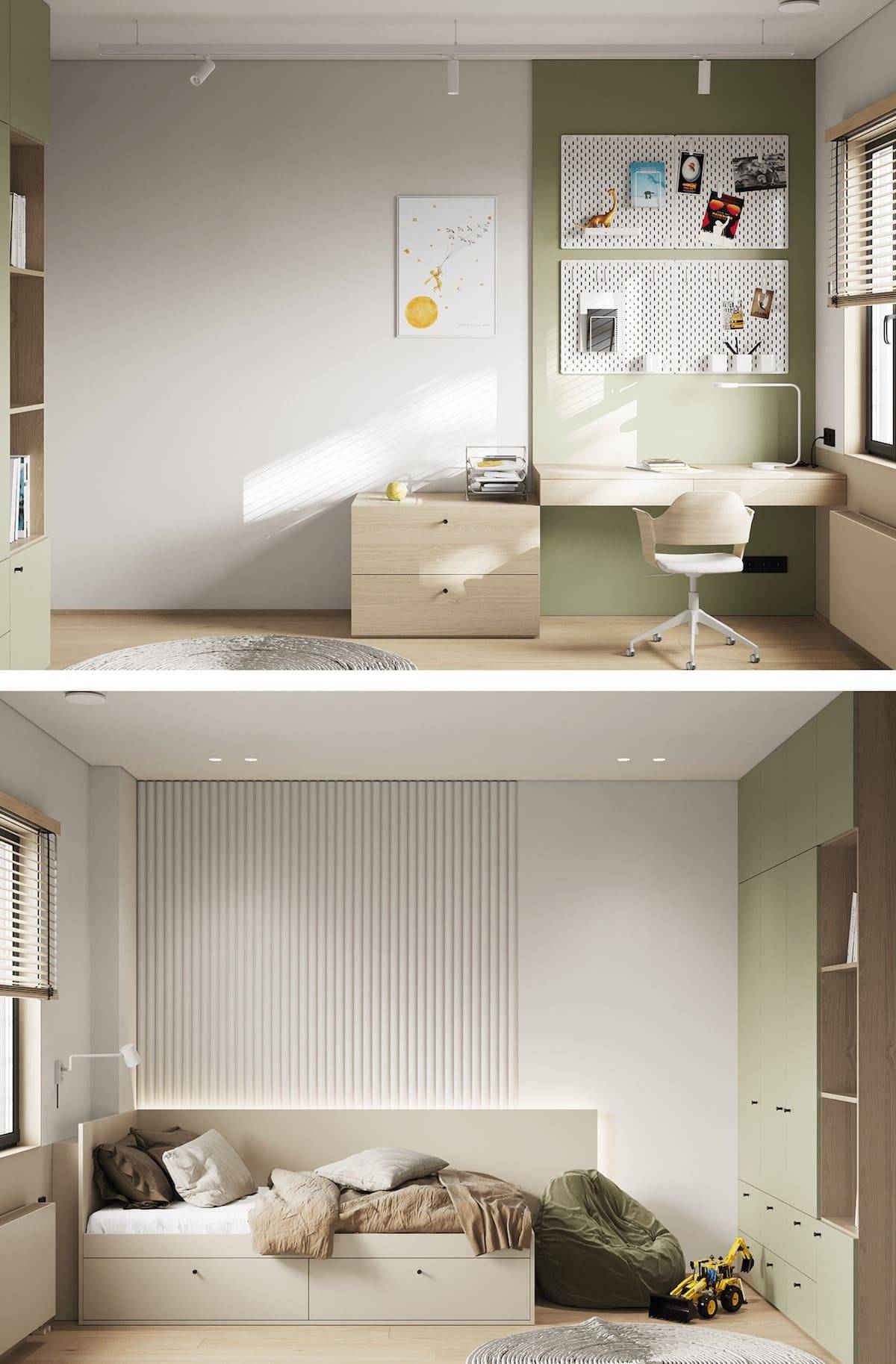 Детская комната в зеленых оттенках настраивает на спокойствие, позитив и творчество. Используйте правильные тона для помещений с северной или южной стороны. Чем южнее, тем холоднее оттенок.