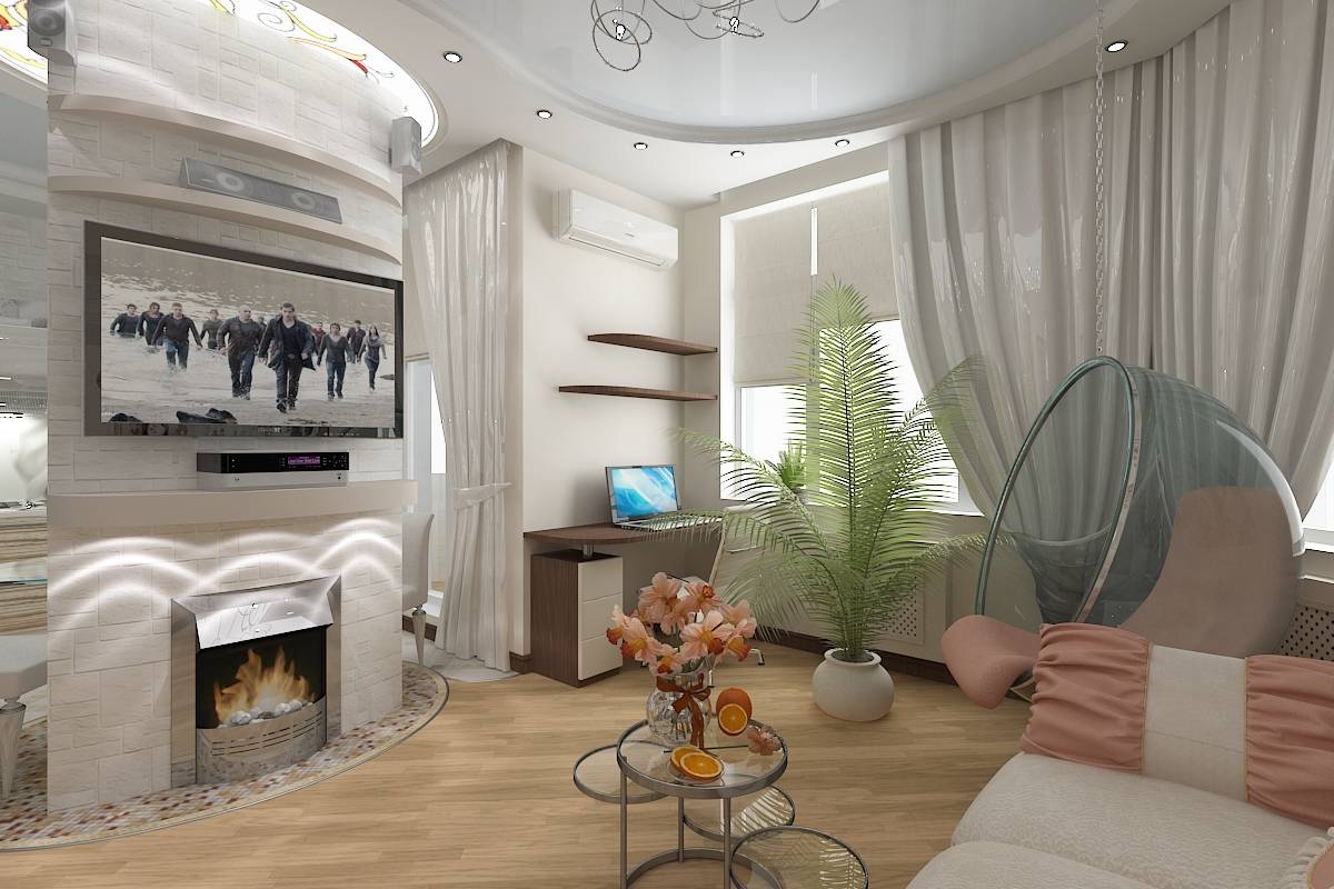 Полноценную гостиную в малогабаритной квартире можно сделать, забрав площадь у другого помещения (например, кухни или балкона). Проекты совмещенных комнат получили огромную популярность, их можно найти в огромном количестве. Самая большая сложность состоит в демонтаже перекрытий и последующей отделке. Но зато после такого ремонта получается красивая и функциональная гостиная.
