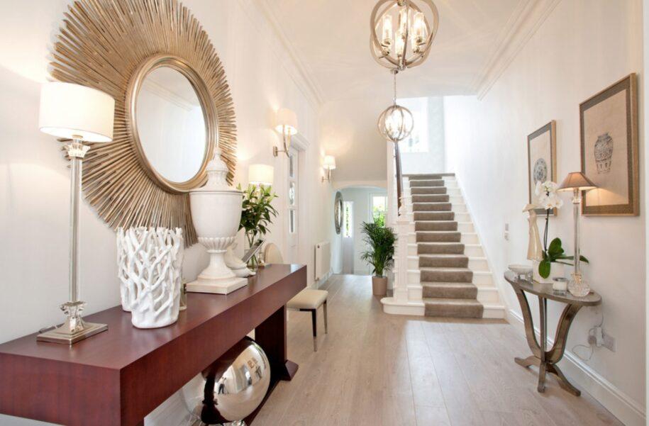 Для проходного места, включая холл, парадную или дизайн для нестандартной прихожей, а это видно на фото, лучше всего заранее продумать зонирование отдельных площадок. Стилизовав стены декором и подбирая правильное освещение по фото, используют не только бра в классическом стиле, но и современную диодную подсветку. Точечное освещение поможет сэкономить на электричестве и создать наиболее комфортное освещение.