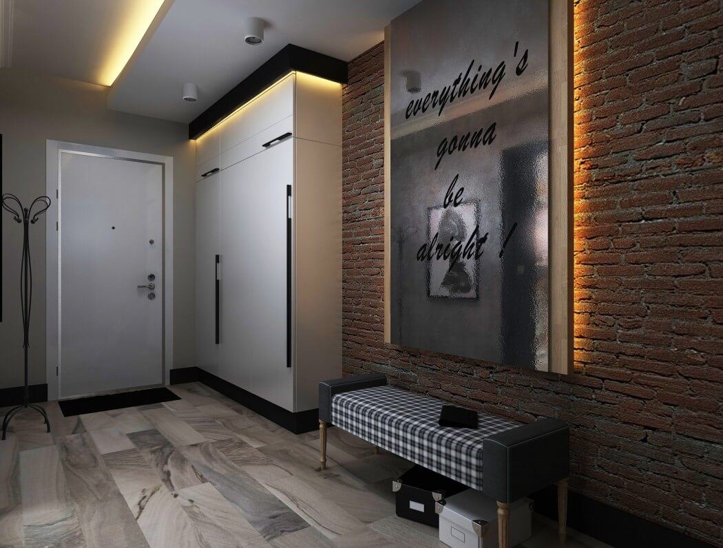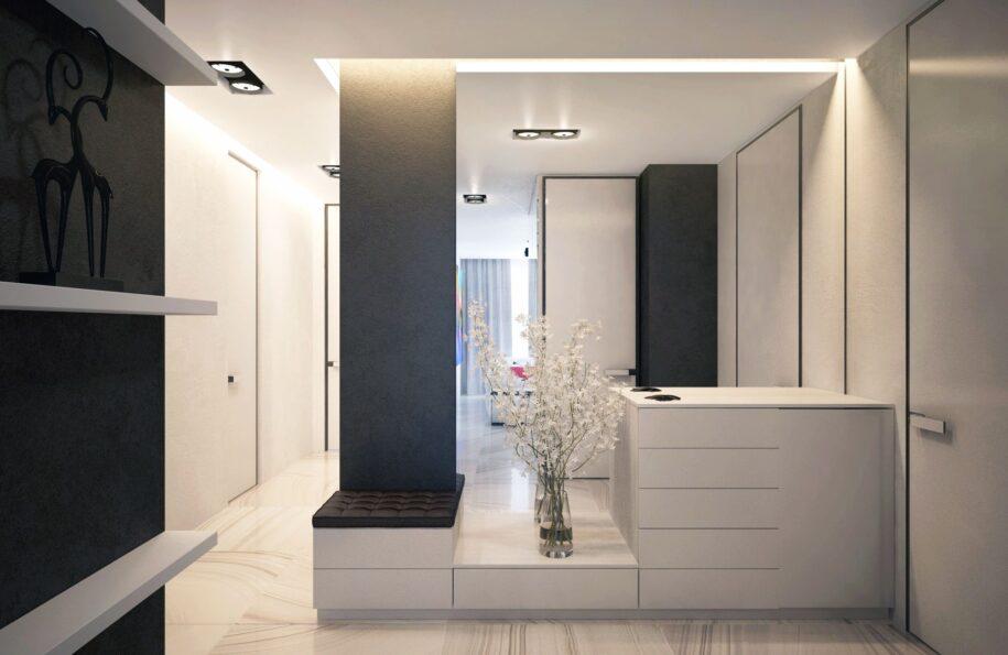 Активно используются разного рода ниши, позволяющие организовать метры не с двухмерной точки зрения, а с трехмерной. Например, удобная скамья в нише, на которой расположены крючки для того, чтобы быстро разместить одежду с улицы. Под скамьей – еще одна ниша, для обуви, которая благодаря теплой подсветке превращается еще и в элемент декора.
