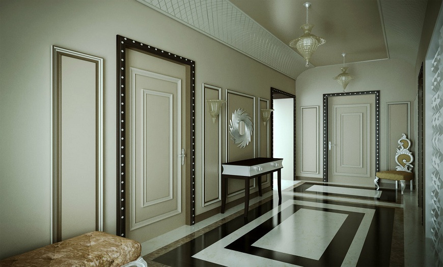 Стиль считается роскошным и слегка вычурным, поскольку предусматривает внедрение смелых идей и нестандартных деталей. В коридоре допустимы многоуровневые потолки, элементы лепнины, фактурная облицовка стен и т.д. Если вы планируете оформить помещение в направлении арт-деко, придется отказаться от бюджетной мебели и дешевой отделки.
