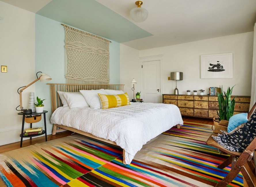 Подойдет самый насыщенный из его оттенков. Это могут быть несколько ярких подушек на кровати или грубый вязаный коврик в крупную бело-циановую полоску.