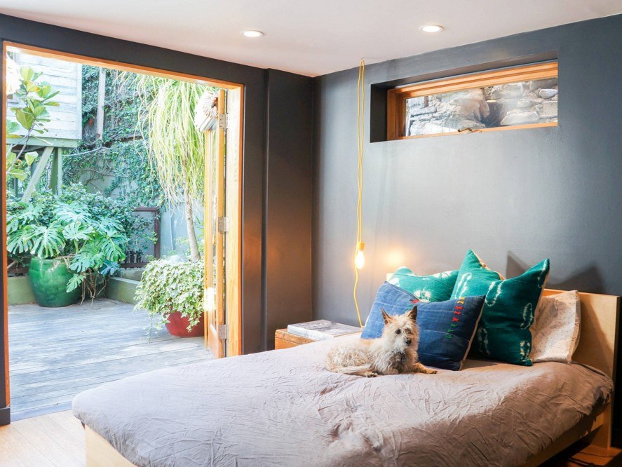 Выбирая кровать, отдавайте предпочтение моделям без заметной спинки. В тренде прием отделки стены за изголовьем кровати такими же деревянными панелями, что и пол.